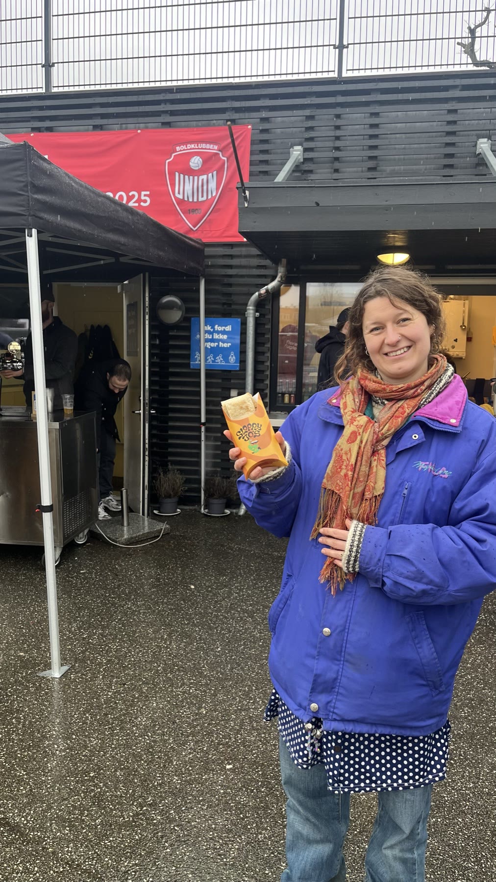 A smiling supporter in a blue coat at Boldklubben Union, holding a branded Sloppy Jo's Hotwrap carton with a hot Flatwrap inside, the Union banner behind.