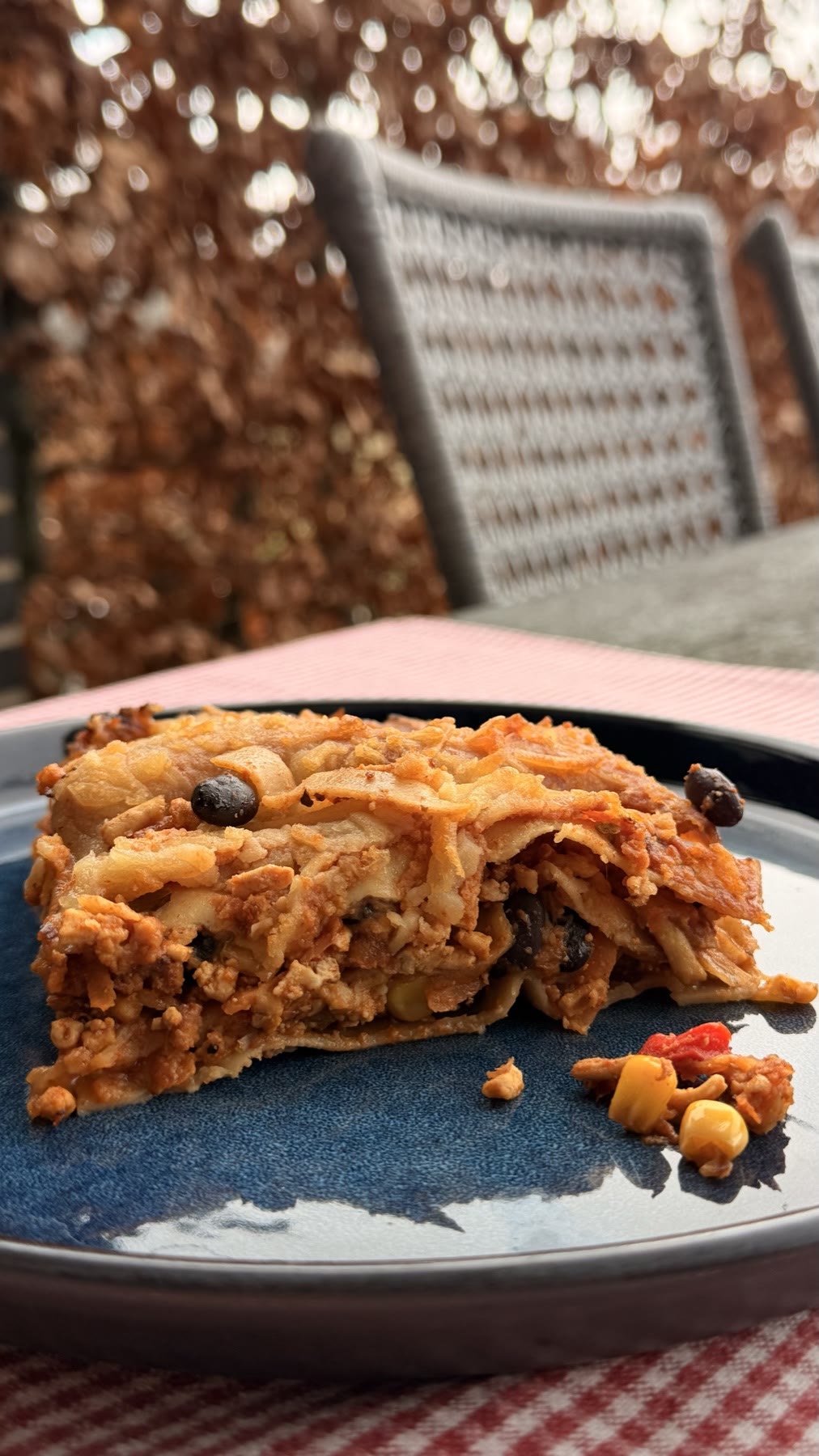 Layered pasta, Mexi filling with black beans and corn, a bechamel thick with Mexi marinade. One tray, 30 minutes in the oven, feeds the table.